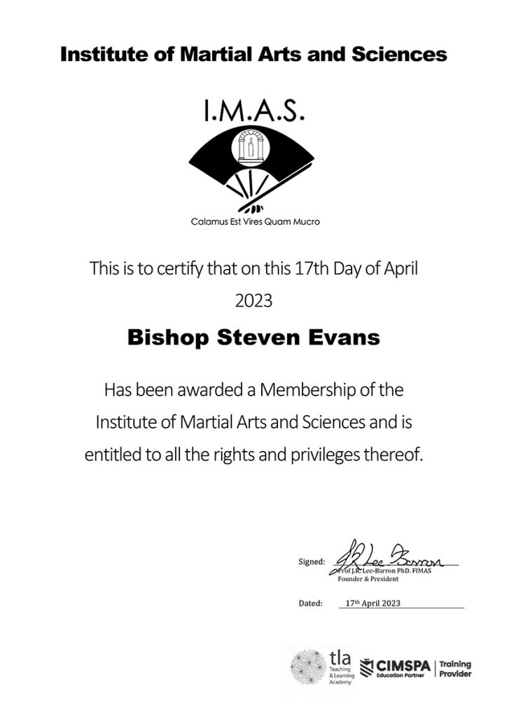 It was both an honour and a privilege to become a member of the Institute of Martial Arts and Sciences (IMAS) in 2023. Over the years, I have greatly valued my fellowship with IMAS Founder and President, Professor Jaimie Lee-Barron PhD, FIMAS. Professor Jaimie is not only a man of vision and insight but also a Christian brother. Under his leadership, IMAS has become one of the first officially recognised professional institutes for martial artists. It is listed in British Qualifications and works in partnership with organisations worldwide through its growing network of regional bases. IMAS is now firmly established as a rapidly expanding global institute.